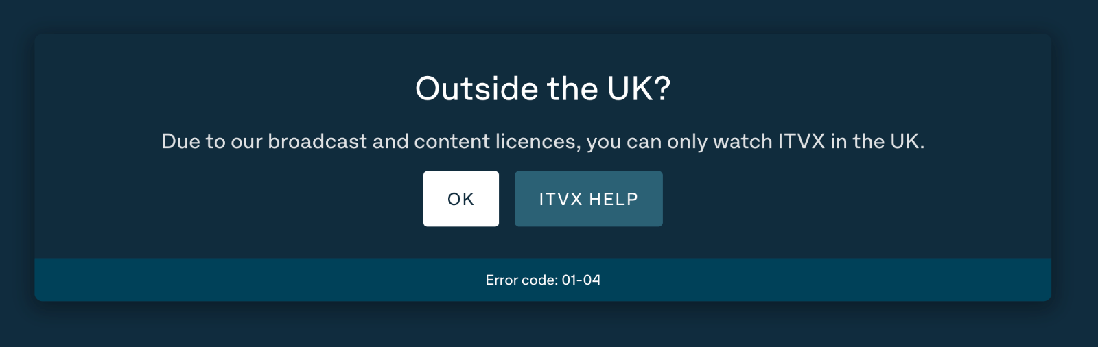 Outside the UK? Due to our broadcast and content licences, you can only watch ITVX in the UK. Error code: 01-04